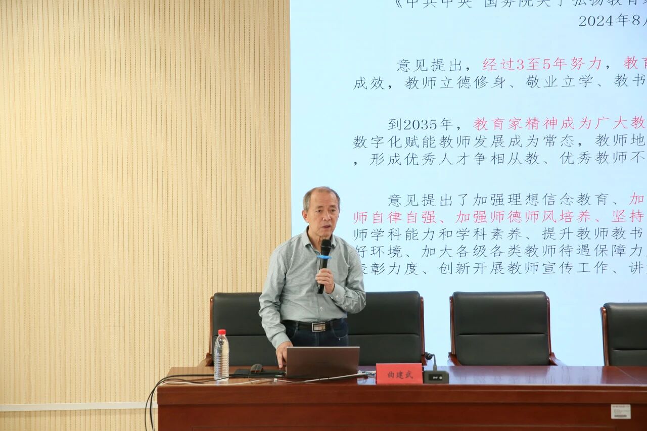曲建武教授结合自身数十载扎根育人一线的经历,围绕“用教育家精神铸魂育人”这一主线,系统解读了教育家精神的核心要义。他以鲜活的事例、真挚的情感和系统的理论,展现了乐教爱生、甘于奉献的仁爱之心和胸怀天下。他勉励全体教职工要恪守初心、勇担使命,将“为党育人、为国育才”的初心深植于心、外化于行,将“立德树人”的根本任务扛在肩上、落到实处。铸魂育人,自觉砥砺师德师风,深耕教坛、精进不辍,以实际行动弘扬教育家精神,努力培养担当民族复兴大任的时代新人。