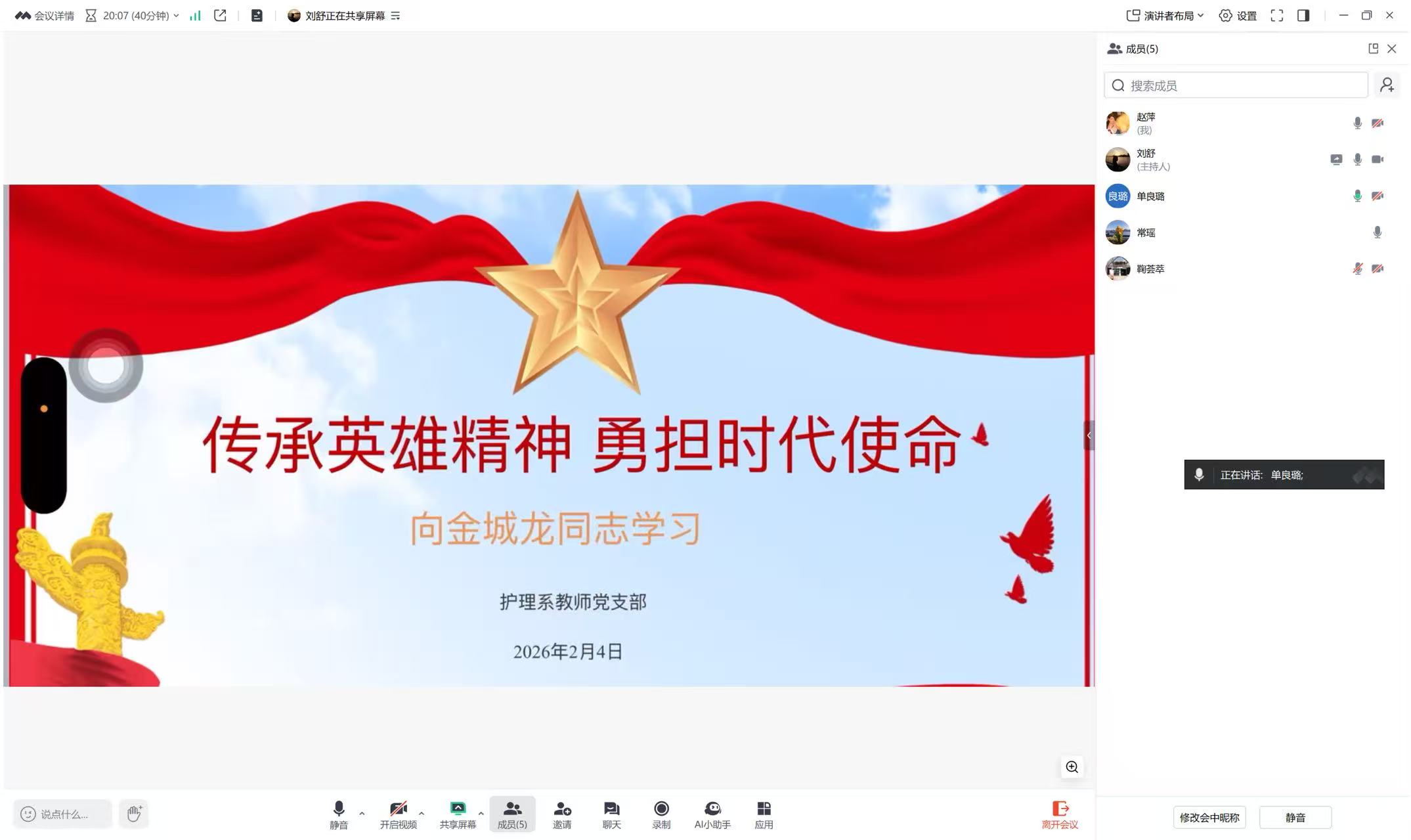 学习研讨环节,师生党员结合自身实际,围绕如何将英雄精神内化于心、外化于行开展深入交流。教师党员紧扣立德树人根本任务,就如何将金城龙同志崇高精神融入教育教学、实践育人全过程进行研讨,一致表示要对标榜样 ,立足教学科研岗位,厚植育人情怀、强化责任担当,努力培养信念坚定、本领过硬、堪当大任的新时代青年;学生党员结合学业成长与志愿服务分享学习感悟,纷纷表示要将学习榜样精神落实到勤学苦练、实践奉献中,主动参与应急救援、社会服务等实践活动,以实际行动践行初心使命,努力成长为担当民族复兴大任的时代新人。