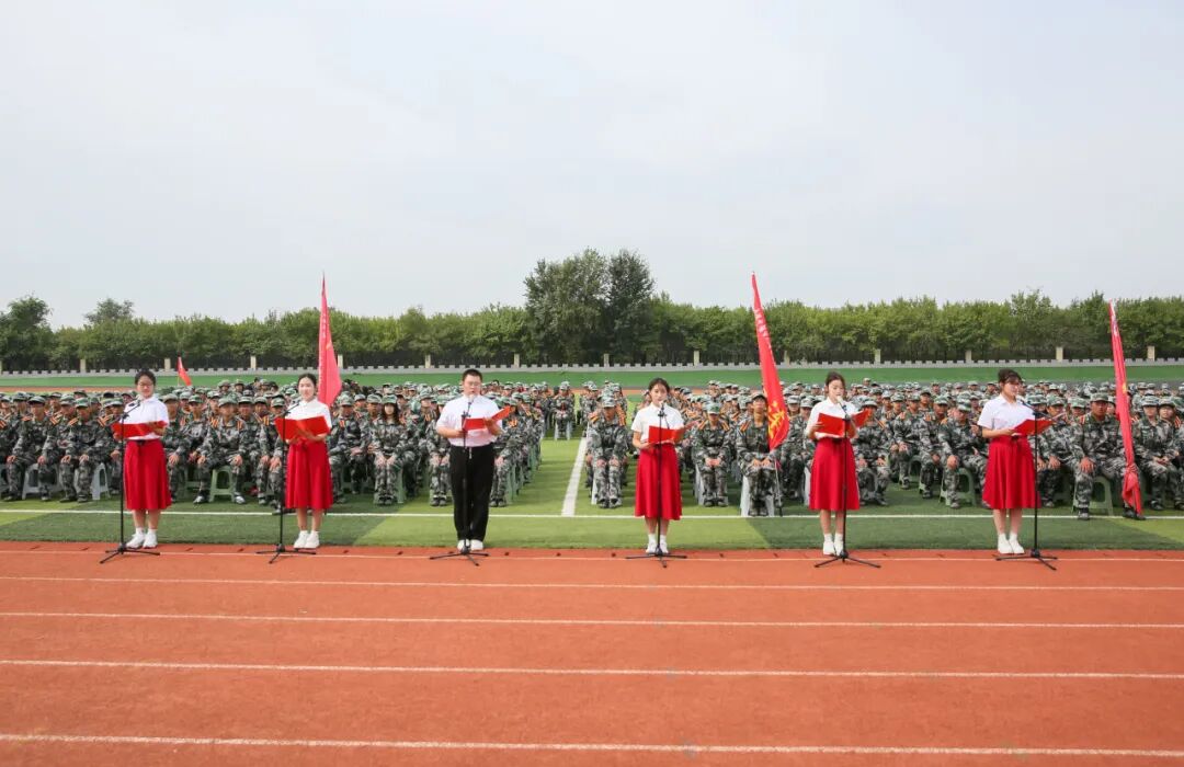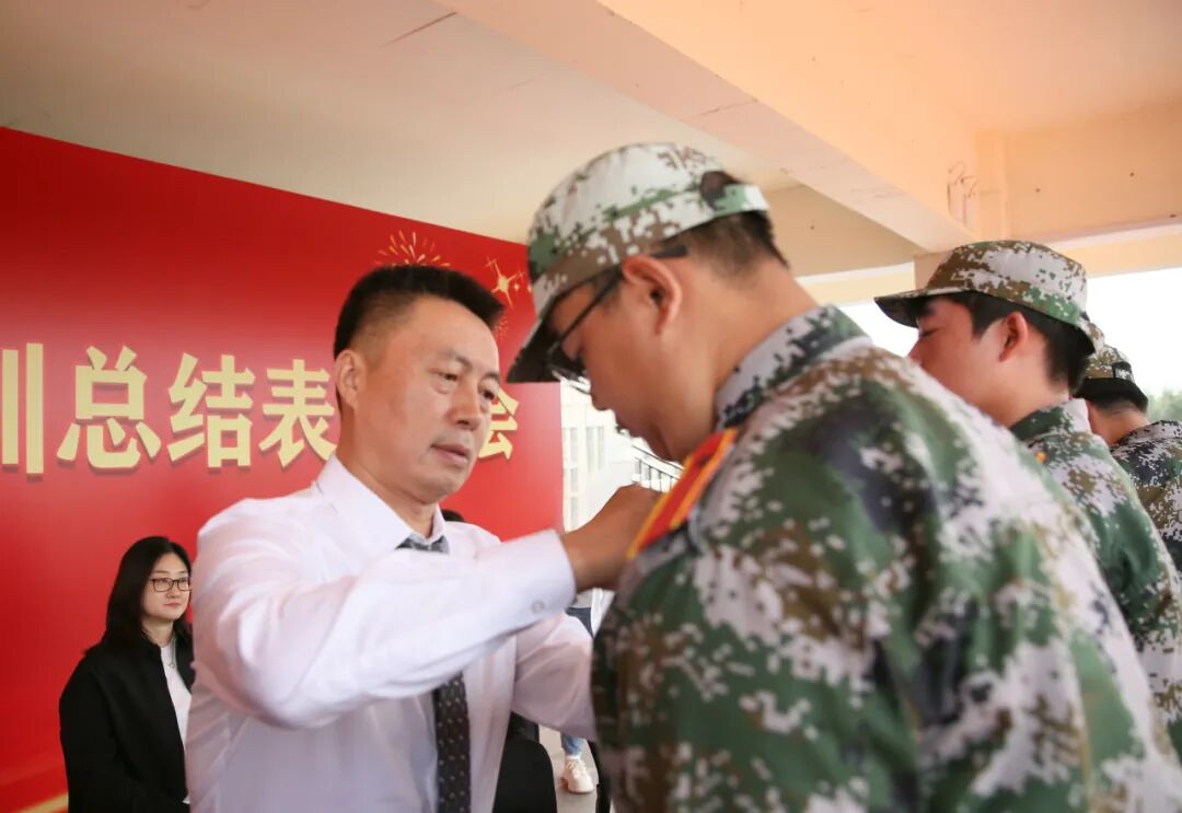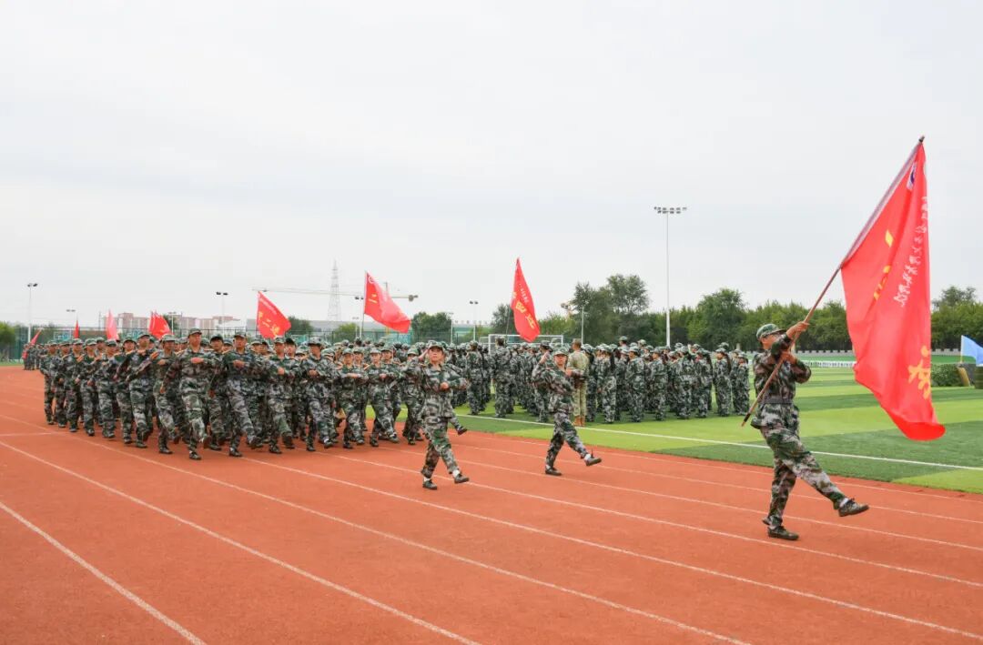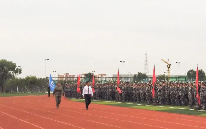 党总支书记王涛检阅各受训队伍。新生们身着整齐军装,身姿挺拔、精神抖擞,以洪亮的口号回应检阅,尽显青春朝气与军人气魄。