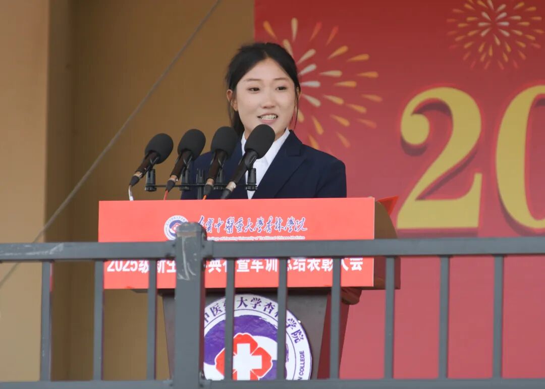 他指出,学校正逐步发展为特色鲜明、口碑优良的中医药类院校,成为服务辽宁乃至东北区域及全国各省基层医疗卫生事业的重要人才培养阵地。在教学科研、人才培养、社会服务的道路上稳步前行,用专业与担当书写着为中医药事业传承创新、为人民健康保驾护航的使命答卷。他强调,在军训中磨砺出的毅力与纪律意识,正是同学们未来面对学业挑战、人生考验时最宝贵的财富。希望同学们能把这份坚持融入接下来的大学生活,以军人般的意志,攻克学习中的难关,战胜成长中的困惑。希望同学们做“有目标的学习者”,做“有担当的行动者”,更要做“有底线的守护者”。始终保持对中医药文化的敬畏与热爱,扎牢专业根基,敢于突破创新,用现代思维解读传统智慧,让古老的中医药焕发新的活力。