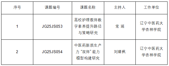 经申报教师自主申报、学校审核提交,辽宁省教育科学规划领导小组批准,我校 1 项课题获批辽宁省教育科学 “十四五” 规划 2025 年度立项课题,2 项课题获批辽宁省教育科学 “十四五” 规划 2025 年度教师队伍建设研究专项立项课题,现予以公示。